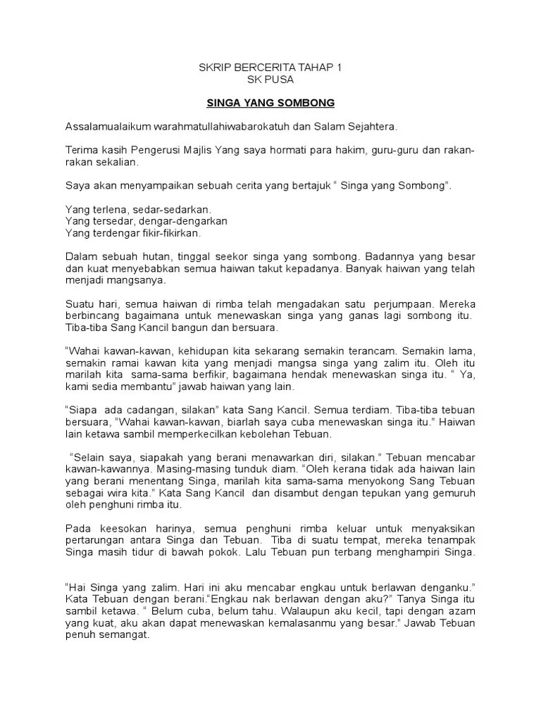 Pertandingan bercerita bahasa melayu tahap 2. Skrip cerita tahap 1 si tanggang anak derhaka. Teks cerita pertandingan bercerita bahasa melayu tahap 1. Maka tamatlah riwayat arnab yang mempunyai gigi yang cantik tetapi pendek akal itu. Teks cerita pertandingan bercerita bahasa melayu tahap 1. Teks pertandingan bercerita tahap 2 tajuk cerita :
